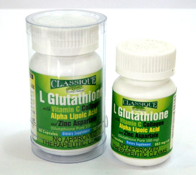 Glutathione DESCRIPTION: 850 mg per capsule Available in 30 capsule and 60 capsule bottles Synergistic formulation of 3 powerful anti-oxidants CONTENTS: L-Glutathione Vitamin C Collagen Alpha Lipoic Acid Zinc Aspartate USAGE: Smokers and alcoholic drinkers On chemotherapy recovery Those exposed to chemicals/pesticides Immuno-therapy support For people who exercise excessively/body builders For those who wish to possess fairer & whiter skin BENEFITS: Protection against damaging effects of free radicals Enhancement of immune responses Less incidences of diseases (esp. chronic Degenerative conditions) Delays premature aging May result to fair and healthy skin RECOMMENDED USE: As dietary support for adults: 1-2 caps / day or as directed by your health care professional.